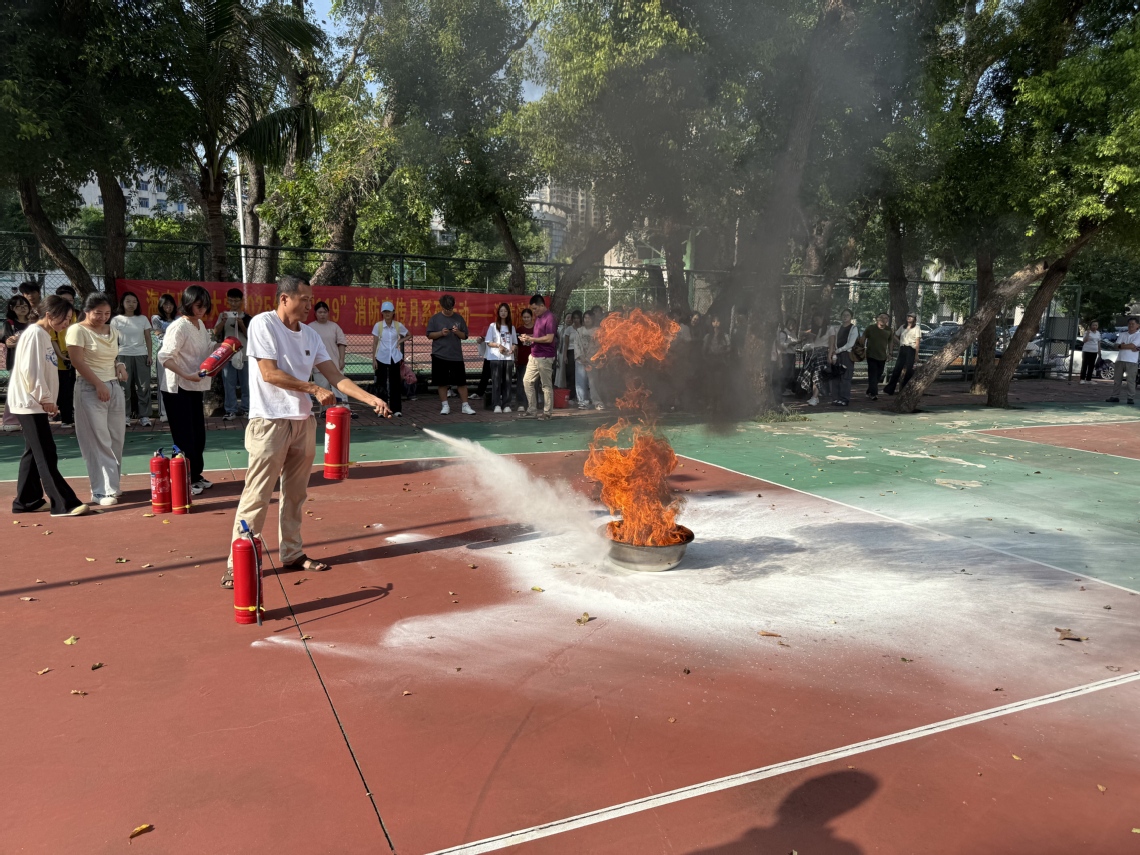 理论讲座结束后,消防技能演练环节在龙昆南校区排球场有序开展。保卫处专职消防员现场示范了灭火器和消火栓的正确使用方法,详细讲解了“提、拔、握、压”等操作步骤。随后,参与师生分组进行实操演练,大家踊跃参与,在工作人员的指导下亲身体验灭火器灭火过程。通过实战演练,师生们切实掌握了灭火器材的使用技能,提升了应对初期火灾的应急处置能力。
